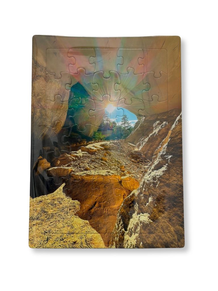35 STStimmungsvolles Puzzle mit Blick aus der Emma Kunz Grotte in die warme Abendsonne. Das ruhige Licht und die besondere Atmosphäre laden zum Innehalten und Entspannen ein.